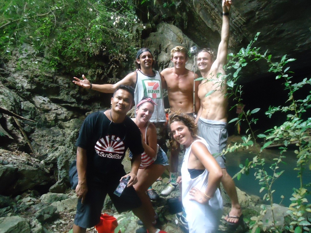 Eventually our raft turned up which was essentially a lot of square floating blocks attached together and one person pulls you through the cave by a rope attached to the other end floating in the water. There was some awesome stalagmites and the roof came down so low sometimes you had to lie flat down to fit under. Loads of bats too, and they were the most adorable little dudes, even though most of them were too busy shagging to notice us. The cave was pretty cool to explore, me and Charlotte had to do an emergency cave pee (dignity at all times), Dennis broke a flip flop, Charlotte put in a stonking effort pulling us back and everyone emerged looking like we’d just played rugby in the mud so decided to wash it all of by throwing ourselves into the lagoon.