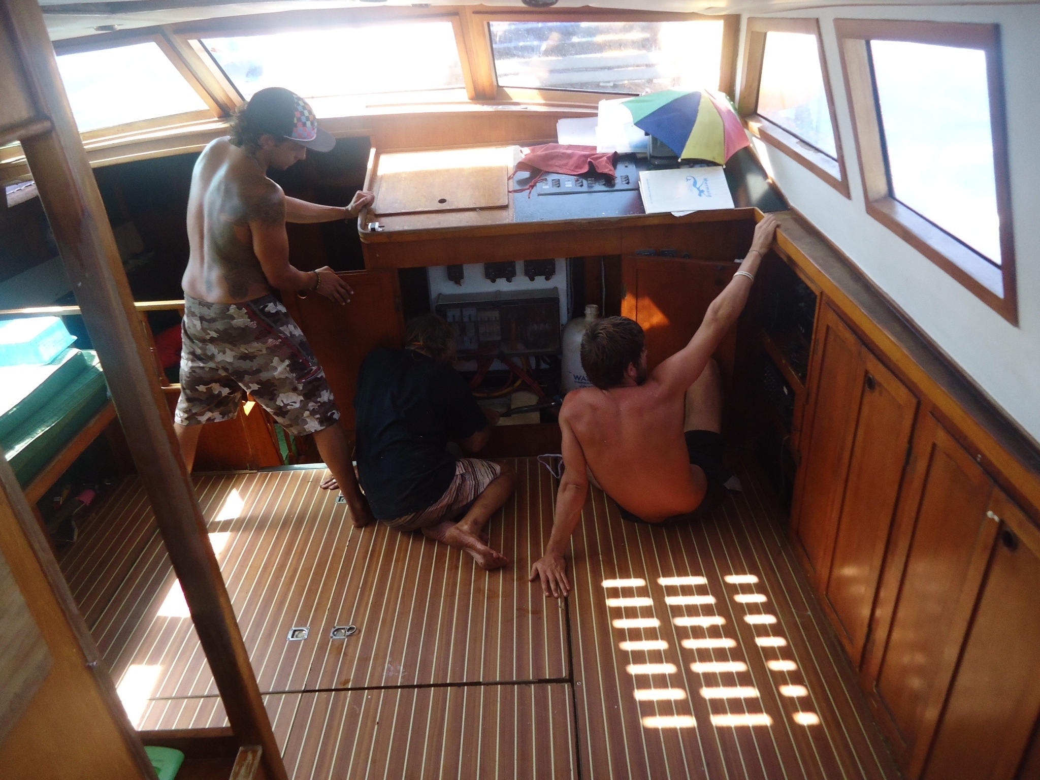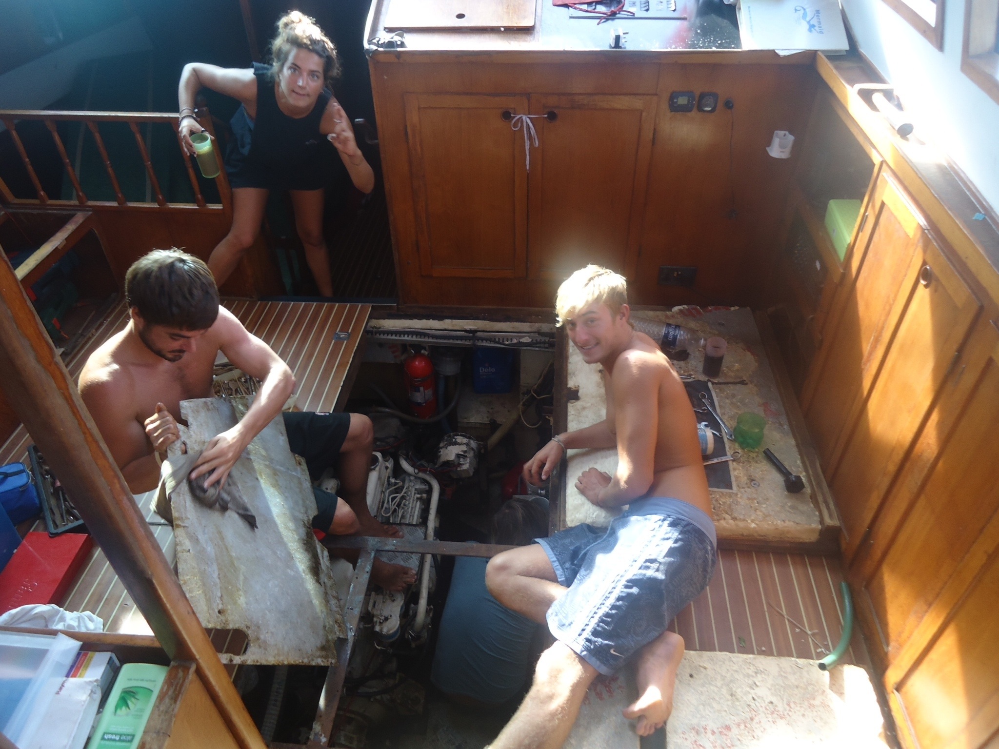 We had about an hour maybe less before the smell of burning rubber permeated the air and the engine shuddered to a halt again. Back into the engine hatch went poor old Dennis, and it turned out the exhaust had overheated because there was no salt water circulating through the engine. Me Chaz and Dustin were sliding round the entrance to the hatch, whilst feverishly trying to pass the right size spanners and whatnot down. During a particularly violent heave from a wave Chaz actually managed to surf from one side to the other without falling over, I bruised my back crashing legs akimbo into the door of a cupboard, Dennis took a box of power tools to the head and the air turned blue. It needed some kind of hose to fix it, which of course we didn’t have. Silence reigned, Dennis sat mutely musing the situation ignoring everyone, whilst Dusty looked stumped and me and Chaz continued to sit on all of the many tools, bits of pipe, cans of WD40 and jubilee clips which rolling freely everywhere. Then all of a sudden with a stout “Right” from Dennis, the stairs were pulled out, and electrical saw produced and from God knows where he triumphantly pulled a bit of pipe. Which then wouldn’t bend. With a look of grim determination he got out the heat gun, and whilst we watched mouth agape, he blasted it until it gave in and meekly bent the way it should of done at the start.