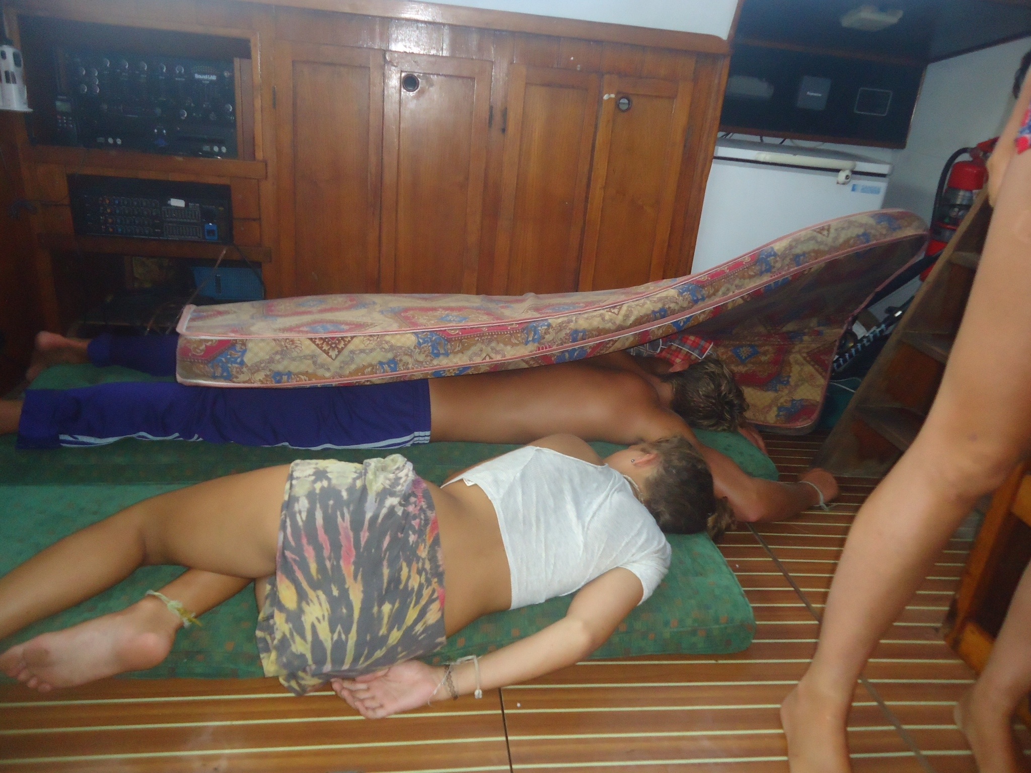 Spirits were high and everyone ready – there was no way we could ever have foreseen what was in store. Pretty much from the get go the weather was against us, and by day 3 of sailing (we should of arrived in Bali already by this point) we’d hardly moved, averaging around 20 miles per night sail. The waves were so big (for the nautical amongst us there was 30 mph winds on the nose and 4 to 5 metre waves) everybody was staggering around hanging on to things like we’d drunk two bottles of whiskey each, people were no longer reacting to the sound of things smashing out the cupboards, I’d seen people slide from one side of the boat to the other on their mattresses trying to get some sleep, the rice cooker went for a burton and cooking was downright dangerous. We were still hanging on in there though, until one brilliant morning the engine cut out. It was the start of a hellish 24 hours.