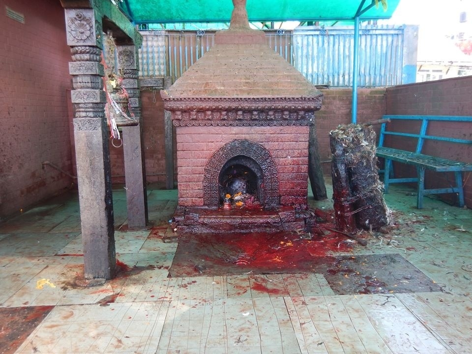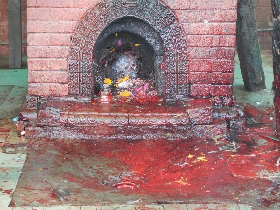 Still in a daze of serene happiness and cheerful ‘Namastes’ to everyone who was just as intrigued by us as us them, it seemed an impossibly idyllic setting and certainly not the backdrop for something as shocking as what goes on there. The temple there is one of the most important to Hindus because it is the temple of Bhagwati, an incarnation of Pavati, who can grant wishes. So couples head here in force to pray for male children. And the best way to ensure you get your wish is to bring a goat for sacrifice, to seal the deal as it were. The temple itself is hectic, bells clanging all over the place, red paint adorning people and goats alike, impossibly long queues to get into the temple, shuffling crowds and you can guarantee you’ll be in the way of a photograph being taken no matter where you’re standing. It was here the smile began to slip from my face for two reasons. One the atmosphere is touching on feverish, there’s almost a just bordering on manic energy to the place which I sponged up straight away and two, the smell. Like the vibe it’s almost just out of reach, an undercurrent, but I got a powerful whiff of it before it slipped under the mask of a hundred incense sticks again. I couldn’t quite place it, a sickly sweet cloying smell, that makes your stomach cringe up and leaves you with a bad feeling. Upon further inspection, and following what we had no idea was the scent of death we found the grisly little pavilion behind the temple, where the floor is slick with sacrificial blood, goat heads sit in piles, flies buzz, and the executioner stands with gore drenched feet looking bored with the whole thing. Soon enough a family pulling a little brown and white goat on a lead turned up. I couldn’t bear to watch but I heard the sound and seconds later I’ve seen the headless body flung on it’s side, legs still trying to run, blood gushing down the drain.
